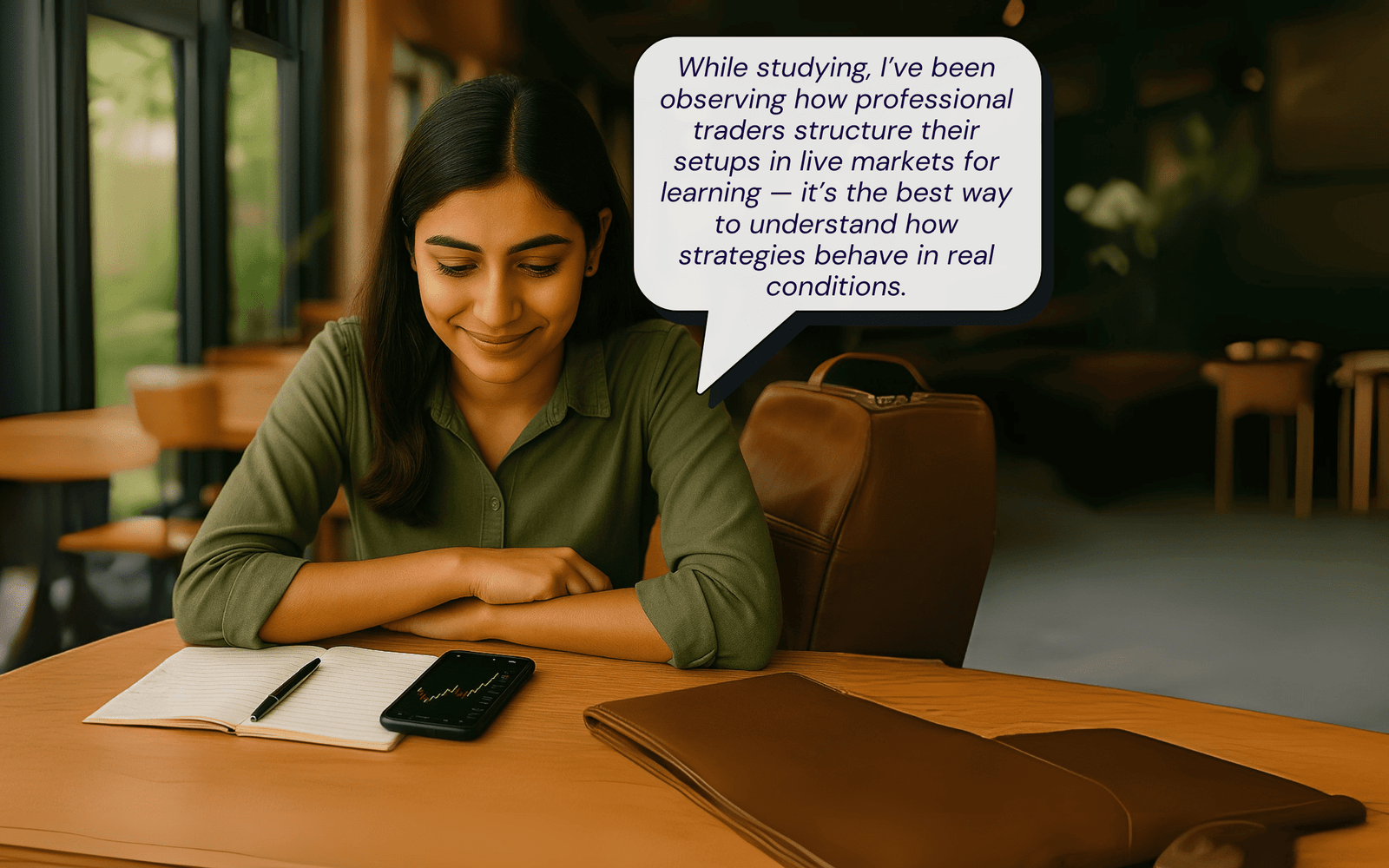 Learning from live markets is the most practical way to build confidence. Here, you don’t follow blindly — you observe how real strategies behave under different conditions, and understand the reasoning behind every move.
